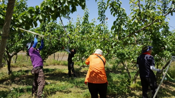 이날 직원들은 아포읍 인리 배 재배 농가를 찾아 봉지 씌우기와 지베렐린 처리 작업에 구슬땀을 흘렸다.