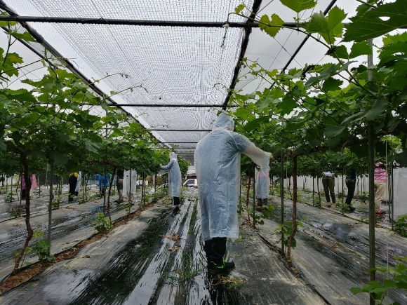 | 김천시 농축산과(과장 강성호)는 농업개발과, 개령면 직원들과 함께 개령면 황계리 소재 3,000제곱미터 규모의 포도농가에 부족한 일손을 보탰다.