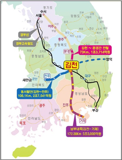 남부내륙철도의 건설은 혁신도시와 일반산업단지의 순조로운 정착을 달성한 김천시가 고속철도 시대의 중심도시로의 위상을 정립할 수 있을 획기적인 사업으로 기대된다. |
