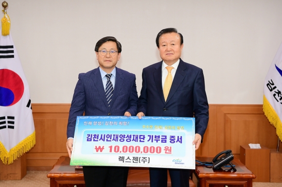 | 김천의 교육발전과 글로벌 인재육성을 위해 렉스젠(주)(대표이사 안순현)에서 김천시인재양성재단(이사장 박보생)에 장학기금 일천만원을 기탁했다.