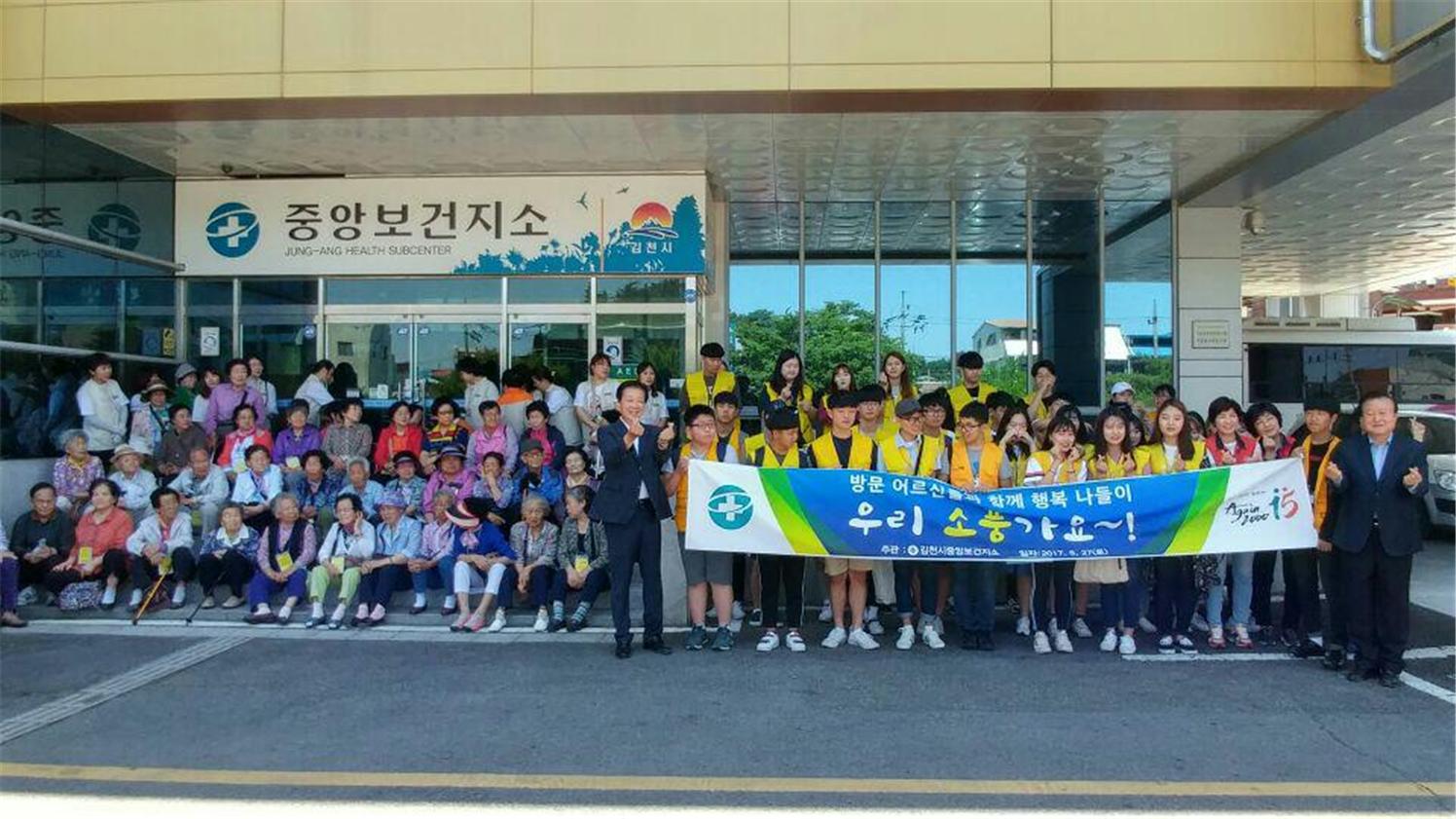 | 김천시는 지난 5월 27일(토) 보건소 방문건강관리사업과 연계하여 실시한“2017 나눔 실천 체험활동”에 방문대상 어르신, 청소년, 대학생, 사업팀 등 102명이 참가하여“행복나들이, 김천시티투어”행사를 가졌다. 취약계층의 지역사회 참여 활성화를 위해 실시한“방문 어르신 행복나들이”는 평소 거동이 불편하여 주변의 도움 없이는 외출이 힘들거나 보호자 없이 혼자 생활하시는 어르신들이 일상을 벗어나 나눔 봉사자와 행복한 시간을 보냈다.