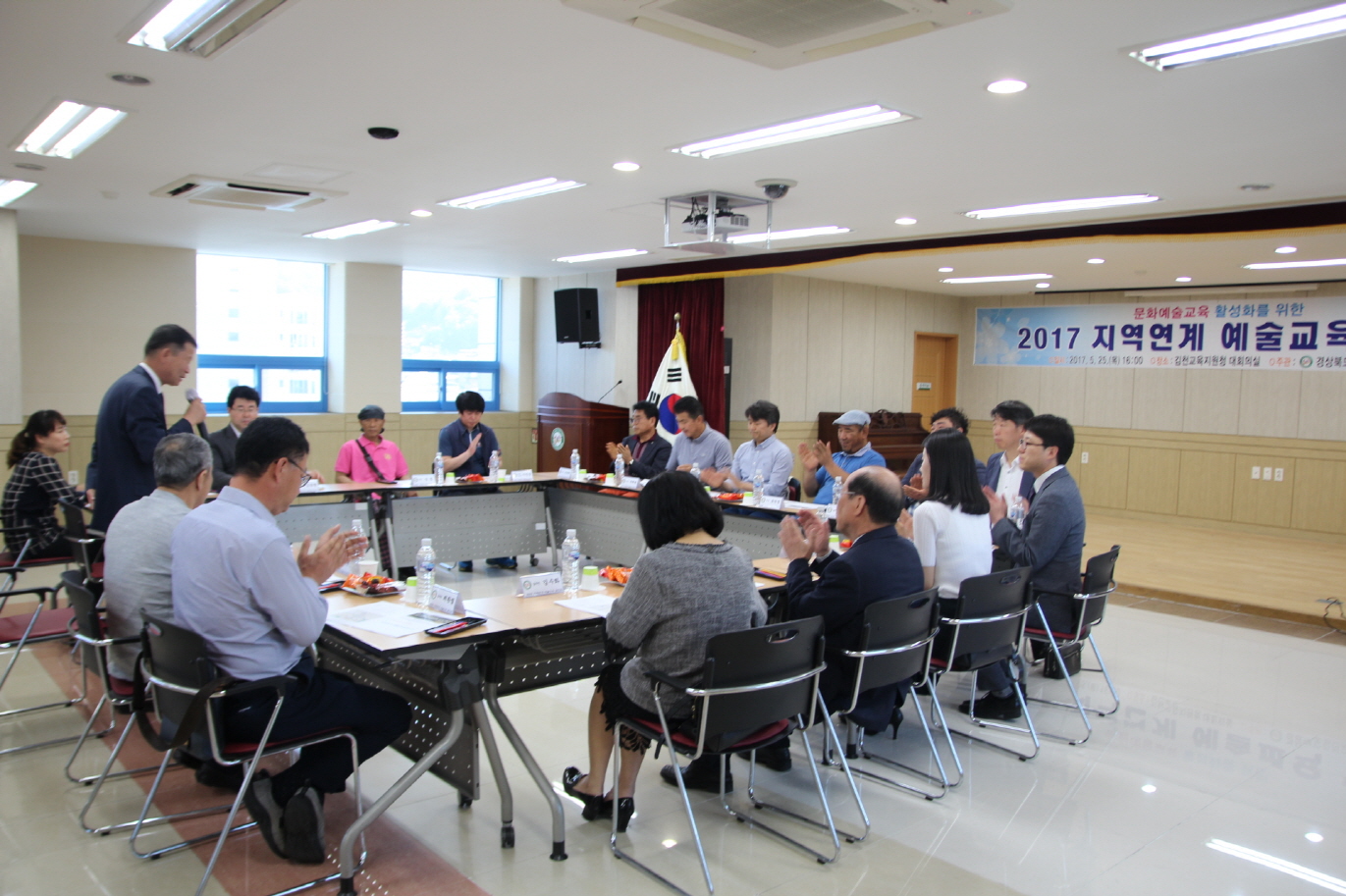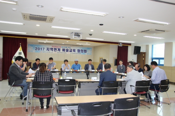 | 경상북도김천교육지원청(교육장 장태덕)은 5월 25일(수) 김천교육지원청 대회의실에서 ‘2017 지역연계 예술교육 협의회’를 실시하였다. 이번 협의회에는 김천교육지원청, 김천시청, 김천대학교, 김천예총, 문인협회, 음악협회, 국악협회, 미술협회, 사진협회, 연극협회, 연예협회 관계자 등이 참석하였다.
