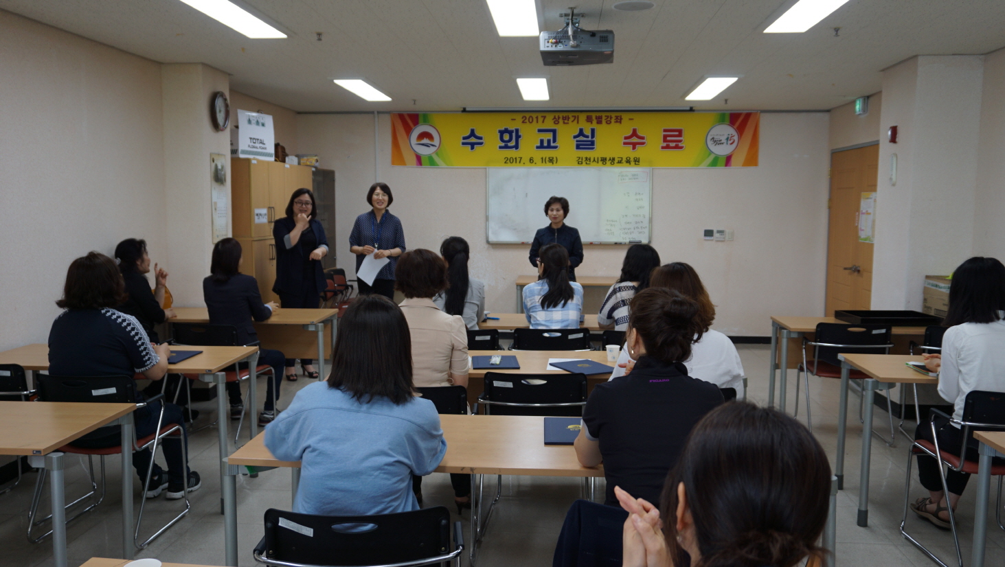 | 김천시평생교육원에서는 6월 1일 평생교육원 2층 강의실에서 특별강좌 수화교실 수료식을 개최했다. 이날 수료식에는 김금숙 평생교육원장, 김미란 한국농아인협회 수화통역센터장과 수료생이 참석했다.
