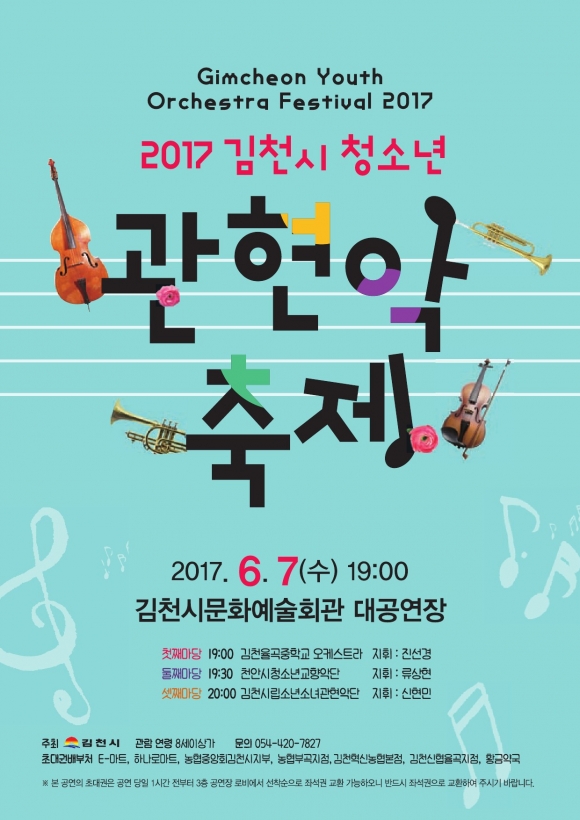 | 김천시문화예술회관(관장 장귀희)에서는 6월 7(수) 오후 7시 대공연장에서『2017 김천시청소년관현악축제』를 개최한다.