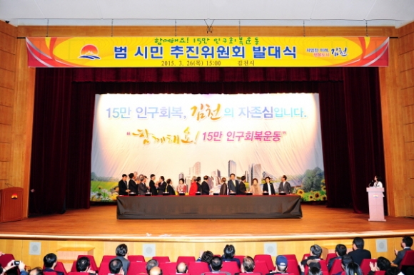|  | | | ⓒ 김천내일신문 | | 현재 김천시 공무원을 비롯, 각계 사회단체는‘김천시 인구 늘리기’운동에 한창이다. 김천시는 1949년도 경상북도에서는 최초로 시로 승격할 당시 금릉군을 포함한 인구가 18만9천명이었고, 1965년에는 21만 5천명으로 영남을 대표하는 중심도시였다. 그러나 1970년대 산업화와 도시화 물결에 편승하지 못해 도시발전이 정체되고, 인구는 반세기 동안 감소를 반복해 왔다.