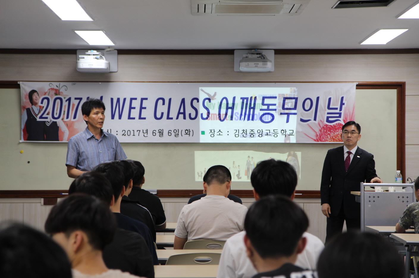 | 학교의 통합적인 개입 및 지원을 통해 학교 부적응을 보이는 청소년들이 행복한 학교생활을 영위할 수 있는 힘을 키워 건강하고 행복한 시민으로 성장할 수 있게 하기 위해 운영 되고 있는 Wee Class에서 2017년 6월 6일 1, 2학년들 42명을 대상으로‘어깨동무의 날’행사를 진행하였다.