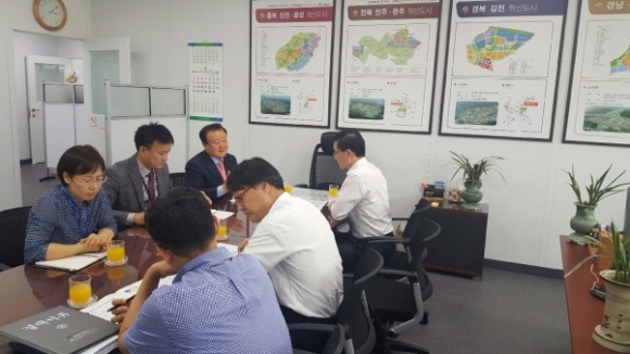 |  | | | ⓒ 김천내일신문 | | 박보생 김천시장은 지난6월 8일에 김천혁신도시 활성화 및 재도약을 위한 각종 사업 건의를 위해 국토교통부(공공기관지방이전추진단)을 방문하여 하였다.