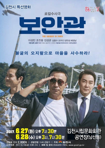 |  | | | ⓒ 김천내일신문 | | 김천시문화예술회관(관장 장귀희)에서는 시민들의 건전한 여가문화 활성화를 위하여 특선영화 <보안관>을 오는 6월27일 오후 7시 30분, 6. 28(수) 오후 3시, 오후 7시 30분 3회에 걸쳐 김천시립문화회관 공연장(남산동)에서 상영한다.