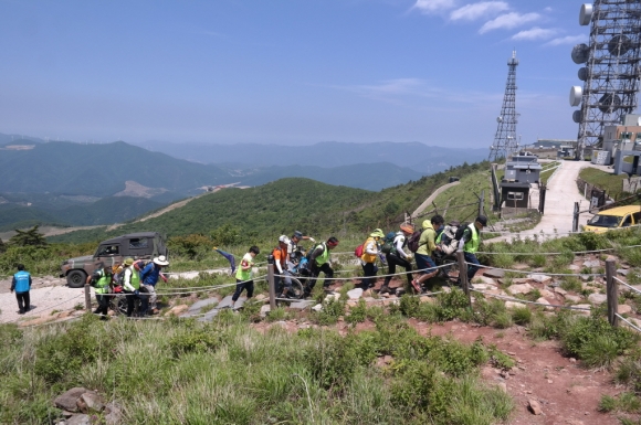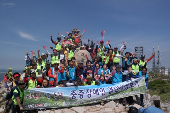 | 김천시(시장 박보생)가 주최하고, 경북지체장애인협회 김천시지회(지회장 박선하)가 주관하며, 대한산악연맹경북김천시연맹이 후원하는 “제9회 중증장애인 열린 세상보기” 행사를 6월 10일 강원도 태백시 함백산 일원에서 실시하였다. 혼자서는 외출이 어려운 하지 중증장애인 10명을 선정, 지회 임직원, 김천시청 사회복지과 관계자, 대한산악연맹 경북김천시연맹 봉사자 등 총 80여명이 참가하여, 이날 아침 7시 직지천 고수부지에 집결하여 함백산을 향해 출발하였다.