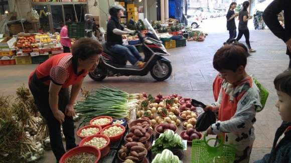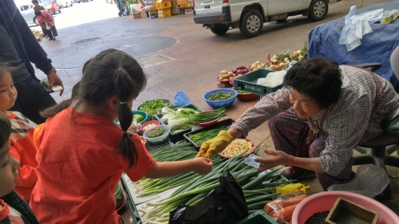 먼저 대형 마트를 견학하고 재래시장을 찾아 “콩나물 얼마예요? 콩나물 천원 만큼 주세요.” “어쿠 예뻐서 덤으로 더 줄게” 라며 시장 사람들과 유아들이 하하 호호 정이 넘치고 활기찬 시장의 모습을 보여주었다.