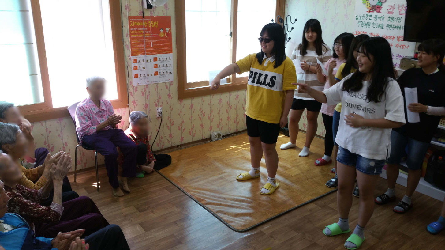 푸른솔 자원봉사단 3학년 학생 이아영은 “처음 봉사활동이지만 할머니와 같이 살기 때문에 어르신들과 좀 더 빨리 친해질 수 있었던 것 같아요. 춤추며 노래 부르는 것이 창피했지만 친구와 함께 해서 웃으며 할 수 있었고 조금 시간이 흐르자 어르신들이 박수쳐 주시고 우리와 함께 흥겹게 춤추며 즐거워하시는 모습을 보며 기뻤어요. 다음에는 더 잘 할 수 있도록 준비할 거예요.”라며 소감을 밝혔다. |