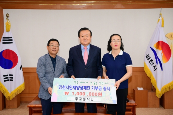 | 김천의 교육발전과 글로벌 인재육성을 위해 김천시 무교동낙지(대표 김영중,배복늠)에서 김천시인재양성재단(이사장 박보생)에 장학기금 일백만원을 기탁했다.