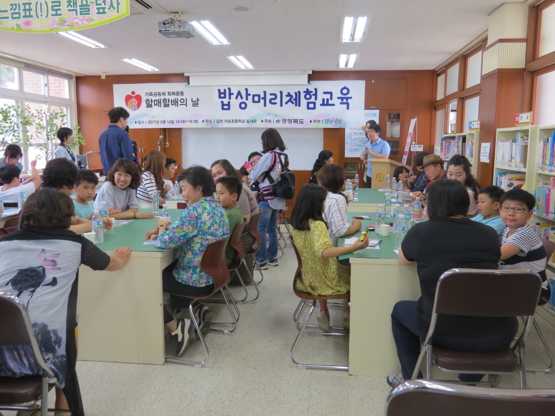 | 아포초등학교(교장 이경옥)는 2017년 6월 14일(수) 14시부터 마을도서관에서 이번 교육을 참가 희망한 본교 학생, 학부모, 조부모님들이 모여 영남일보에서 주관 ‘가족공동체 회복운동 할매할배의 날 밥상머리체험교육’에 참여하였다.
