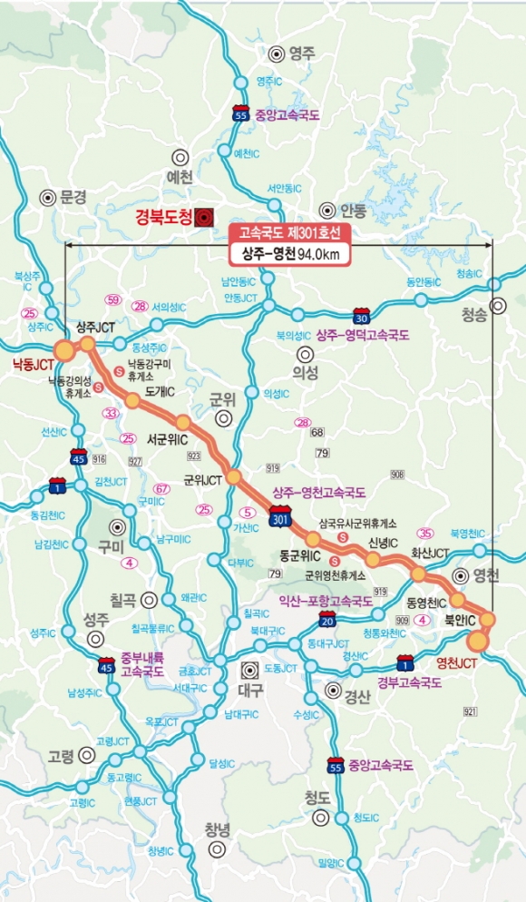 상주시 낙동면 승곡리에서 영천시 북안면 임포리까지 총연장 94km로 5년간(2012~2017) 2조1,460억원(국비 4,258, 민자 1조7,202)이 투입됐다.