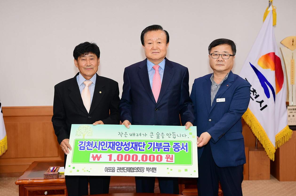 한편, 아포읍 박석현 관변단체협의회장은 2009년부터 2017년 현재까지 오늘 기탁한 일백만원을 합해 총 3회에 걸쳐 일백삼십이만원의 장학기금을 기탁하였다.