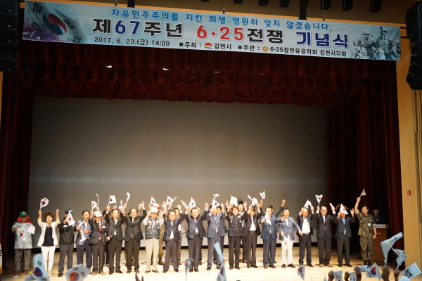 |  | | | ⓒ 김천내일신문 | | 김천시는 지난 6월 23일 김천문화회관에서 6‧25전쟁 제67주년을 맞아 호국영령들의 넋을 기리고 6‧25참전 유공자의 숭고한 희생정신과 호국보훈 의식 고취 및 나라사랑 정신을 함양하는 제67주년 6‧25전쟁 기념식을 거행하였다.