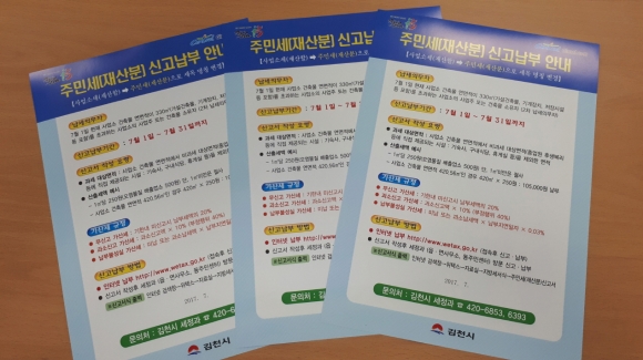 | 김천시(시장 박보생)는 7월 한달을 주민세 재산분(구. 재산할 사업소세) 신고·납부기간으로 정하여 운영한다.