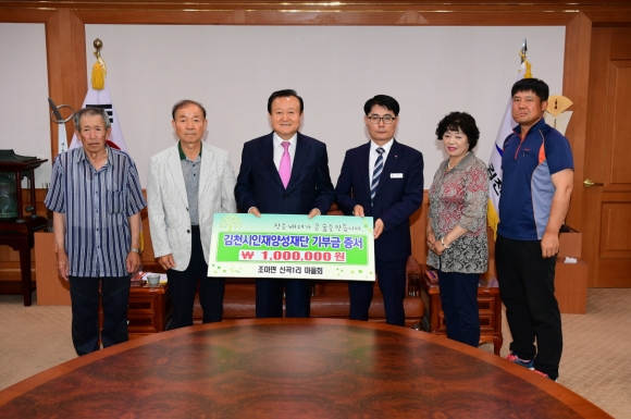 | 김천의 교육발전과 글로벌 인재육성을 위해 조마면 신곡1리 마을회(이장 류지수)에서 김천시인재양성재단(이사장 박보생)에 장학기금 일백만원을 기탁했다.
