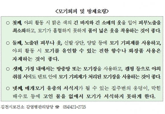 | 김천시 보건소(소장 손태옥)는 최근 부산지역에서 일본뇌염매개모기(작은빨간집모기)가 경보발령기준이상으로 발견되어 전국에 일본뇌염 경보가 발령됨에 따라 각종 질병 매개모기의 활동이 활발한 여름철에 야외활동과 가정에서 모기회피 및 방제요령을 준수해 줄 것을 당부하였다.