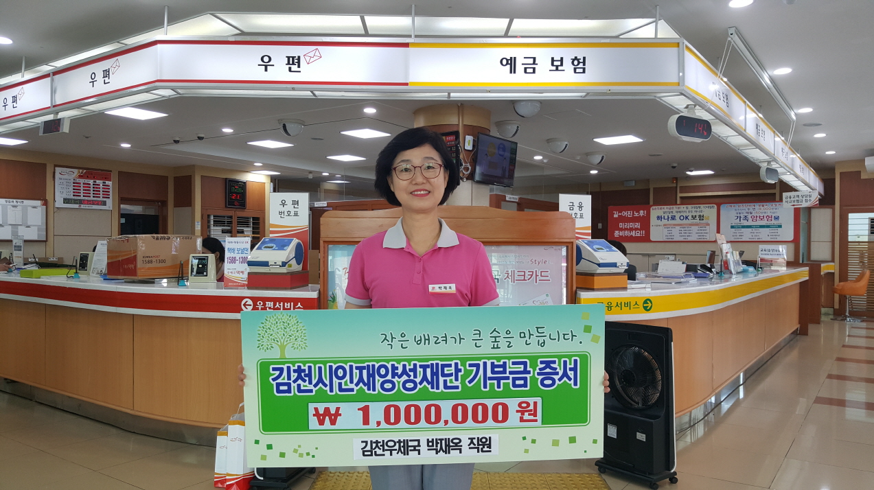 | 김천의 교육발전과 글로벌 인재육성을 위해 김천우체국에 근무하는 박재옥 직원이 김천시인재양성재단(이사장 박보생)에 장학기금 일백만원을 기탁했다.
