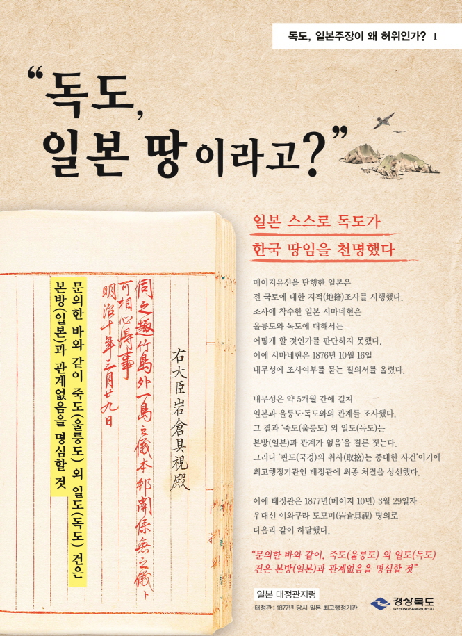 한편, 경북도는 오는 연말 배포를 목표로 일반인들이 쉽게 이해할 수 있는 역사적 논증을 담은 독도 영상홍보물 제작에 들어갔다.