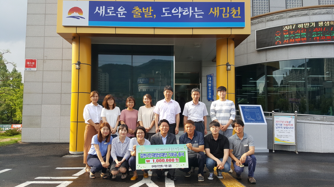 | 김천의 교육발전과 글로벌 인재육성을 위해 대곡동주민센터(동장 최우락) 직원 일동이 김천시인재양성재단(이사장 박보생)에 장학기금 일백만원을 기탁했다.