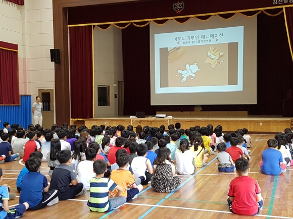 | 김천시(시장 박보생)는 2017년 아토피⋅천식 안심기관 어린이 및 학생 1,500여명을 대상으로 6월부터 아토피 피부염 예방 관리교육을 실시하고 있다. 안심기관으로 지정된 16개 초등학교, 유치원 및 어린이집의 학생교육 뿐만 아니라 아토피⋅천식 유병조사를 시작으로, 하반기에는 인형극, 천연보습제 만들기 체험 등 학교중심 예방사업을 추진하고 있다. 아토피 피부염 예방관리교육은 어린이집, 유치원생, 초등학교 저학년, 고학년 등 대상에 맞는 동영상을 활용하여 아이들이 일상생활에서 손쉽게 아토피 관리를 할 수 있는 방법을 알려주며, 또한 인형극을 실시하여 시각적인 효과를 높이고, 보습제 만들기 체험은 천연성분을 주재료로 하여 건조하고 간지러운 피부를 빠르게 진정시킴으로 아토피 피부가 아니더라도 환절기 피부 건강을 위해 꾸준히 사용하면 아주 좋은 효과가 나타난다.