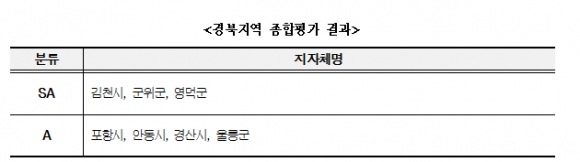 | 종합평가 결과, 3대 분야(공약이행완료 분야, 2016년 목표달성 분야, 주민소통 분야)의 합산 총점이 80점을 넘어 SA등급을 받는 지자체는 모두 59곳의 지자체였으며, 시에서는 경기 성남시 외 16곳, 군에서는 부산 기장군 외 11곳, 구에서는 서울 용산구 외 29곳이었고, 경북지역 23개 기초지자체 중에 총점이 100점 만점에 80점을 넘어 SA등급을 받은 지자체는 김천시, 군위군, 영덕군 3곳이고, 총점이 100점 만점에 70점을 넘어 A등급을 받은 지자체는 포항시, 안동시, 경산시, 울릉군 4곳이었다. 고령군, 봉화군은 무투표당선 지역으로 이번 평가에서 제외하였다.