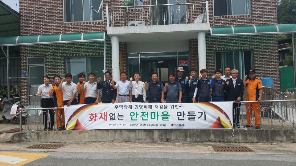 이번 행사는 김천소방서와 합동으로 원거리에 위치한 대형 소방차량 진입곤란 마을의 자율안전 관리체계 구축을 위하여 기획되었으며, 소방서 합동 안전점검 및 기타 화재취약요인을 제거하고, 마을대표 명예소방관 위촉 및 화재 없는 안전마을 현판식 행사 순으로 진행되었다.