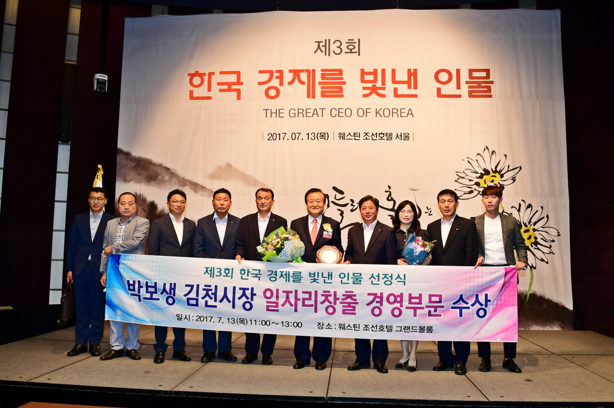 | 박보생 김천시장은 7월 13일 서울 웨스틴 조선호텔에서 개최된 『제3회 한국경제를 빛낸 인물 선정식』에서 ‘일자리창출 경영부문’ 수상을 하였다.