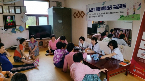노년기 관절예방관리 프로젝트 사업은 한의사 외 4명이 팀을 이루어 주1회 총8회 과정으로 오지 어르신들에게 관절염 예방관리에 관한 이론과 체험을 병행한 한방진료, 관절강화 및 통증 경감을 위한 스트레칭, 뼈건강에 도움이 되는 건강밥상 등 노년기 관절관리를 위한 맞춤형 프로그램이다.