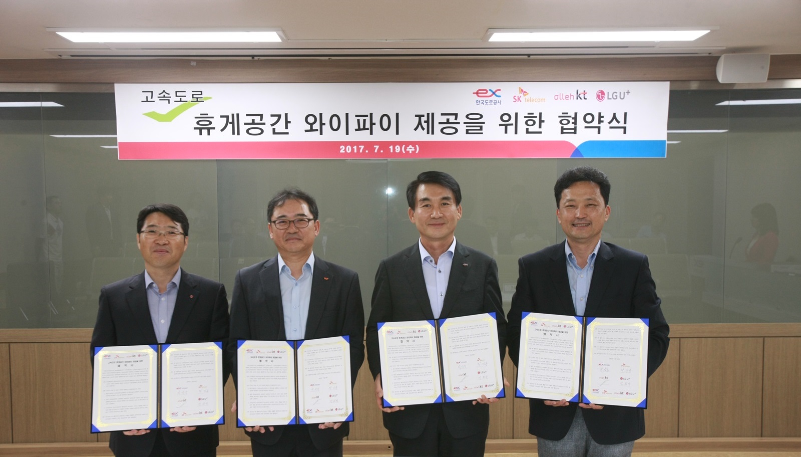 한국도로공사는 19일 성남에 위치한 교통센터에서 이동통신 3사(KT, SK텔레콤, LGU+)와 ‘무료 와이파이 확대’에 관한 협약을 체결했다고 밝혔다. 이는 정부의 통신비 절감방안 중 하나인 ‘공공 WI-FI 확대’를 신속히 이행해 고속도로 이용자들의 편의를 증진하기 위해서다.