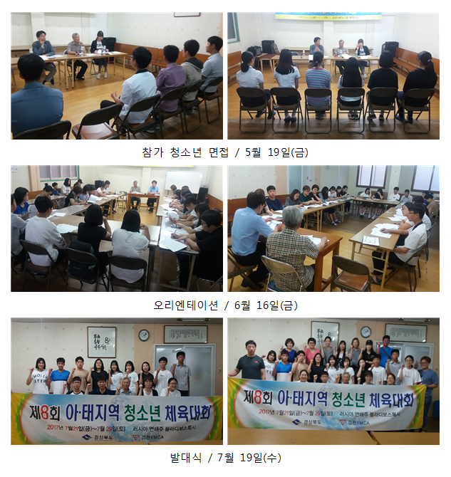 대회종목은 7개(수영, 배드민턴, 실내축구, 탁구, 3X3농구, 체스, 유도)로 한국, 러시아, 중국, 일본, 라오스, 베트남 등 6개국 300여명의 청소년이 참가하게 되는데 김천YMCA는 7개 종목 중 배드민턴과 수영에 참가하기로 결정하고 신청한 청소년을 대상으로 5월 19일(금) 면접을 통하여 배드민턴 4명(남자 2명, 여자 2명), 수영 8명(남자 4명, 여자 4명)을 선발하고 참가학생과 학부모와의 예비모임과 오리엔테이션을 가지고 종목별로 연습을 해 왔었다.