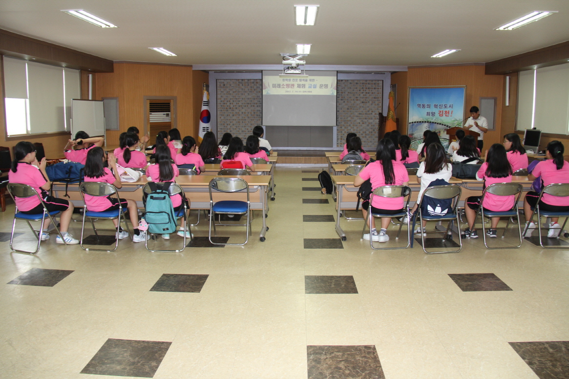 | 김천소방서(서장 백남명)는 7월 19일 학생들이 여러 직업세계를 체험하고 앞으로의 진로를 탐색하는 과정인 자유학기제 운영과 연계하여 성의여자중학교 1학년 학생을 대상으로 미래소방관체험교실을 운영했다.