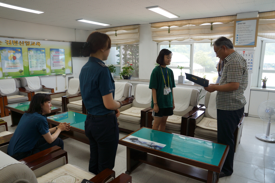 | 김천경찰서(서장 김영수)에서는 7월 20일(목) 상반기 동안 실시되었던 어울림 콘테스트 최우수작으로 선정된 김천 신일초등학교를 방문하여 교육장상을 수여하였다.