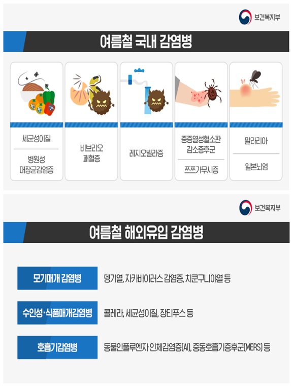 여름철에 주로 발생하는 국내 감염병으로는 ▲물이나 음식으로 감염되는 세균성이질, 병원성 대장균감염증 ▲어패류를 충분히 조리하지 않은 채 섭취할 경우 비브리오패혈증 ▲냉각탑, 목욕탕 등의 오염된 물을 호흡기로 흡입하여 발생하는 레지오넬라증 ▲작업 또는 야외할동을 하는 경우 진드기와 모기에 물려 발생하는 중증열성혈소판감소증후군(SFTS), 쯔쯔가무시증, 말라리아, 일본뇌염 등을 들 수 있고, 그 외에 해외유입으로 인한 감염병으로 뎅기열, 지카바이러스, 콜레라, 세균성이질, 동물인플루엔자 인체감염증(AI), 중동호흡기증후군(MERS)등이 있다.