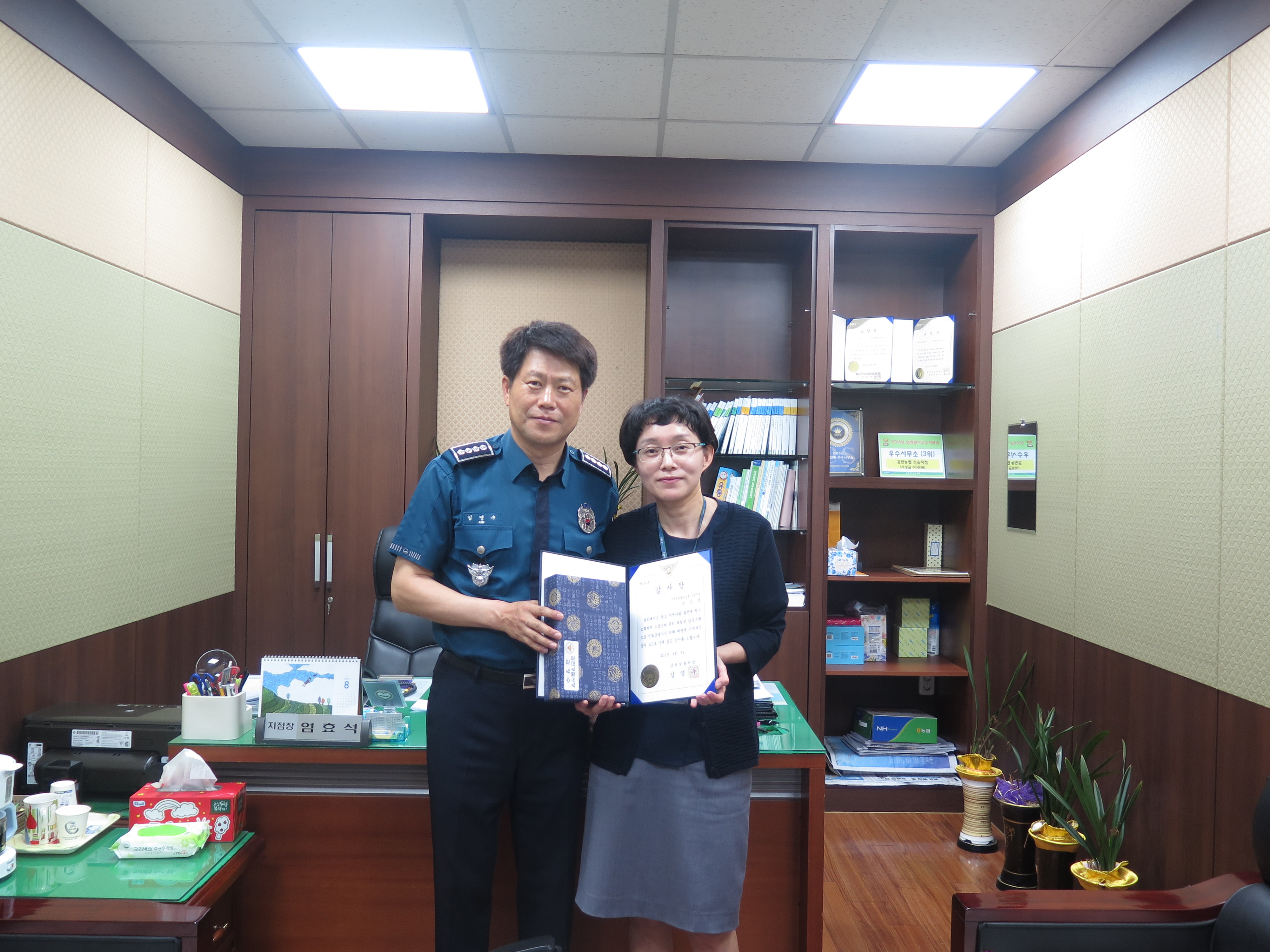 | 김천경찰서장은 8월 3일 농협은행을 방문하여, 전화금융사기를 사전 예방한데 기여한 농협은행 여직원에게 감사장을 수여했다.