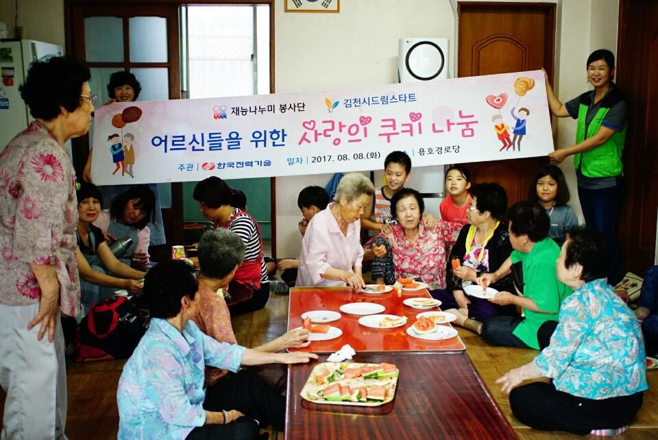 | 김천시 드림스타트는 지난 8월8일 화요일 드림스타트 부모와 아동, 한국전력기술 나누미 봉사단 40명은 드림스타트 인근 경로당인 모암경로당과 용호경로당을 방문하여 자원봉사 활동을 펼쳤다.