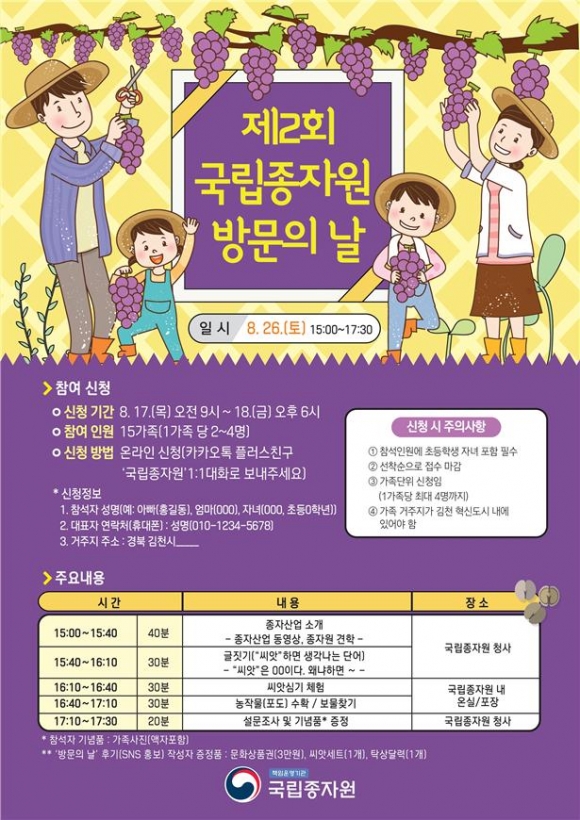 국립종자원(원장 오병석)은 김천 혁신도시 지역주민을 대상으로 8.26(토) 오후 3시부터 초등학생 자녀와 가족이 함께하는 ‘국립종자원 방문의 날’ 행사를 진행한다고 밝혔다.