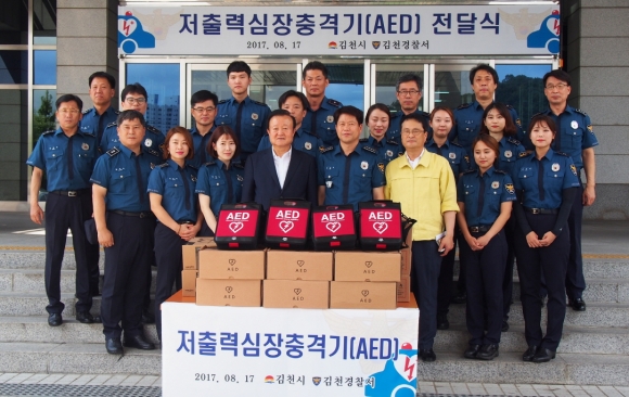 | 김천경찰서(서장 김영수)에서는 8월 17일(수) 김천시로부터 관내 112순찰차 전체(20대)에 시민의 심장골든타임 확보를 위한 AED(심장자동재세동기)를 전달받는 행사를 가졌다.