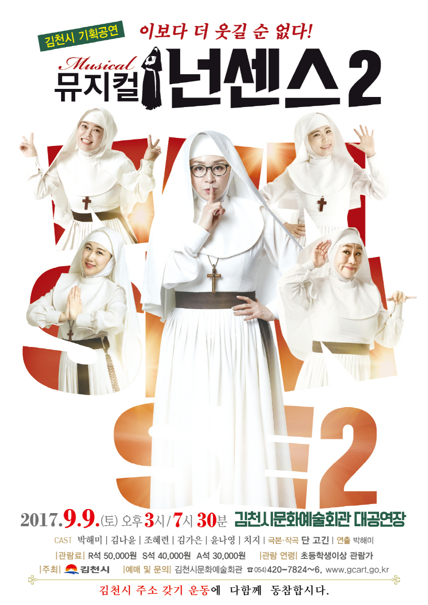 장귀희 관장은 “원작보다 한층 더 화려해지고 웃음이 가득해진 다섯 수녀들의 요절복통 코미디를 통해 남녀노소 모두 함께 관람할 수 있는 공연을 준비하였으니 가족, 친구 및 지인들과 함께 하셔서 즐거운 시간 보내시길 바란다”고 전했다. 이 공연은 초등학생이상 관람가이며, 공연시간은 120분이다. 또한 관람료는 R석 50,000원, S석 40,000원, A석 30,000원이며 김천시문화예술회관(홈페이지 상단 빠른 예매, 사무실 방문 및 전화)을 통하여 8월 24일(목) 오후 2시부터 관람권을 구입할 수 있다.