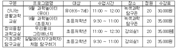 프로그램은 우리 주변에서 과학을 체험으로 이해하는 ‘신나는 생활과학교실 - 9월 과학놀이터’, 그린에너지로 자동차와 집을 만들고 요리도 해보는 ‘융합과학교실 - 우리들의 그린에너지’, 달과 태양, 화석 등 지구과학을 탐구해보는 ‘기초과학탐구교실 - 갈릴레이(지구과학자)처럼 탐구하기’가 있다.