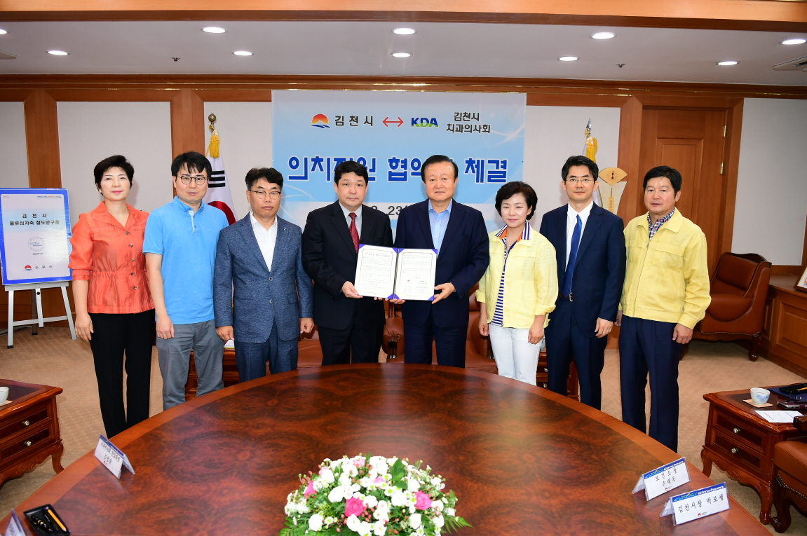| 김천시는 23일 김천시치과의사회와 의치보철 지원을 위한 민⋅관 업무 협약을 맺고 지역의 구강건강을 챙기는데 힘쓰기로 했다. 시는 2016년 6월말 65세 이상 의치시술비 의료보험 적용으로 국비지원이 종료됨에 따른 의치시술지원 조례 제정과 자체예산 확보(5천만원)로 지속적으로 지원 할 수 있게 되었다. 안경민 치과의사회장은 지역의 어려운 이웃을 위해 필요한 사업이며 취약계층 구강건강증진을 위해 조금이라도 도움을 줄 수 있도록 최선을 다하겠다.”고 말했다. 한편 박보생 김천시장은 시민의 치아관리를 위해 계획수립에서 사업시행까지 김천시와 치과의사회가 지속적으로 협력관계를 구축할 수 있도록 많은 관심을 비롯, 살기 좋은 건강한 김천을 만들어 가는데 힘이 되어 주기를 바란다고 전했다. 기타 의치지원사업에 대한 궁금한 사항은 김천시보건소 중앙보건지소 지역보건담당(☏ 421-2782)로 문의하시면 됩니다. |