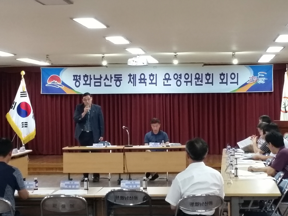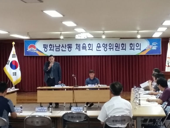 | 평화남산동 체육회(회장:이정인)는 8월 22일 운영위원회를 개최하였다. 10월 13일에 열리는 시민체육대회에 대한 평화남산동의 참여계획을 논의하기 위한 이 자리에는 체육회장과 고문, 부회장, 평화남산동 김영욱동장 등이 참석하였다.