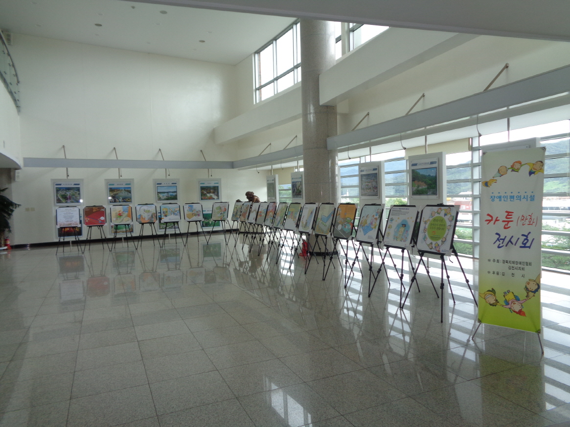 | (사)경북지체장애인협회 김천시지회(지회장 박선하)는 지난 8월 24일 김천시립도서관 1층 로비에서 「장애인편의시설 카툰전시회를 개최하였다. 이번 전시회는 9월7일까지 2주간 장애인편의시설 홍보 카툰(만화) 20점을 전시하게 된다.