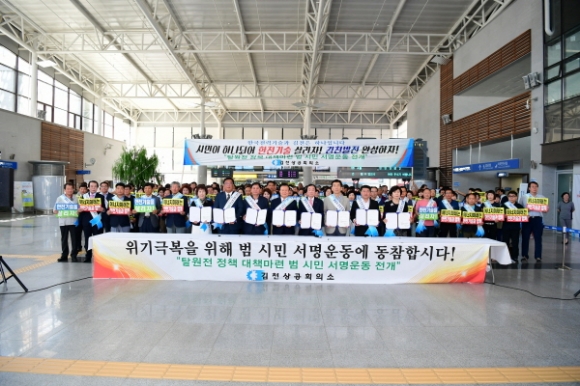 |  | | | ⓒ 김천내일신문 | | KTX김천(구미)역에서는 지난 9월 1일 김천상공회의소(회장 김정호)의 주관으로 김천시민 300여명이 참석한 가운데 ‘한국전력기술 위기 극복을 위한 범시민 서명운동 선포식’이 개최되었다.