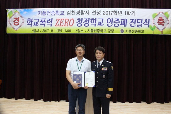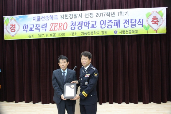 | 지품천중학교는 지난 9월 1일 본교 강당에서 “제1회 김천경찰서 선정 2017학년도 1학기 학교폭력 ZERO 청정학교 선정!!”인정패 전달식이 있었다.