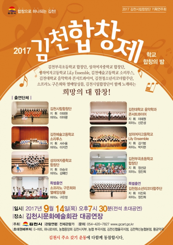 김천시문화예술회관(관장 장귀희)에서는 9월 14일(목) 오후 7시 30분 대공연장에서『시립합창단 2017 김천합창제』를 개최한다.