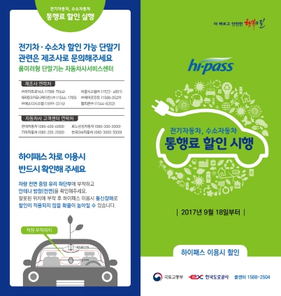 한국도로공사는 이달 18일부터 전기차와 수소차에 대한 통행료 할인제도가 시행된다고 밝혔다. 이는 친환경차 보급계획, 미세먼지 관리 특별대책 등 친환경정책 지원을 위한 것이다.