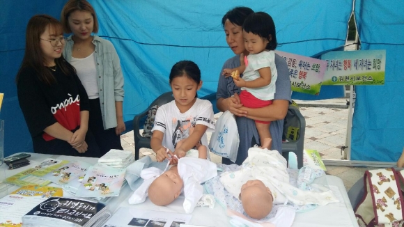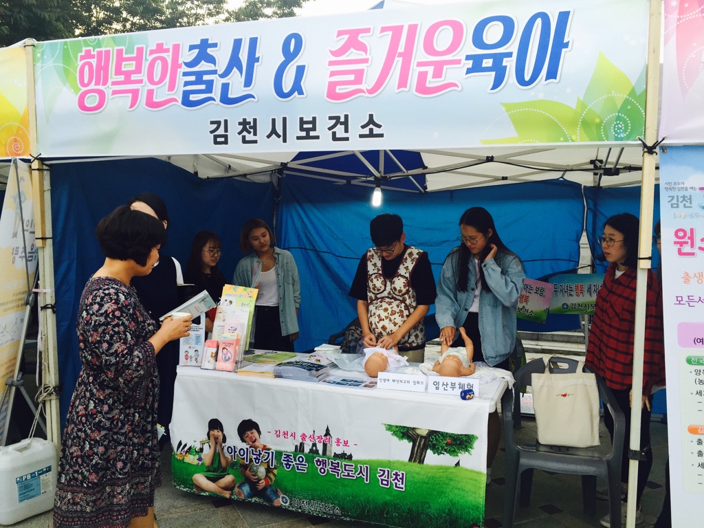 이날 김천시 보건소에서는 출산 친화적 사회적 분위기 조성을 위해 임산부 체험과, 신생아 기저귀 채우기, 배냇저고리 입히기, 속싸개 싸는 법을 직접 체험하도록 하였으며, 임신‧출산‧양육에 대한 각종 정보 제공과 상담을 병행하고, 출산지원 사업 안내 소책자, 리플릿 배부 등 홍보에 주력하였다.
